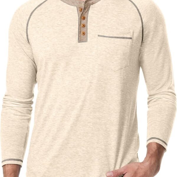 - Regular-fit cotton raglan shirt for spring, summer, and fall. Features a four-button design and distressed seams for a rugged look.